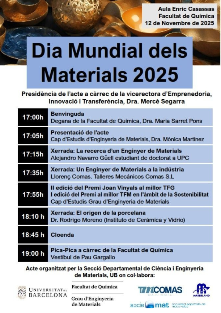 La jornada del Día Mundial de los Materiales de la Facultad de Química de la Universidad de Barcelona tuvo lugar el 12 de noviembre. En ella se presentaron los premios Joan Vinyals al Mejor TFG en Ciencia de Materiales y el premio al Mejor TFM en Ciencia de Materiales en el ámbito de la sostenibilidad. Además se presentaron charlas de Alejandro navarro, Llorenç Comas y Rodrigo Moreno que departió sobre el origen de la porcelana.