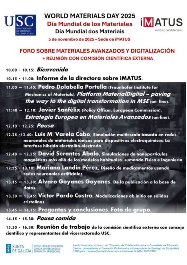 El 5 de noviembre de 2025, en iMATUS, Universidad de Santiago de Compostela, se celebró un foro sobre Materiales Avanzados y Digitalización. Participaron Pedro Dolabella, Javier Sanfélix, Luis M. Varela, David Serantes, Mariana Landín, Álvaro Goyanes y Víctor Pardo, quienes presentaron temas sobre transformación digital, estrategia europea, simulaciones y diseño de medicamentos.